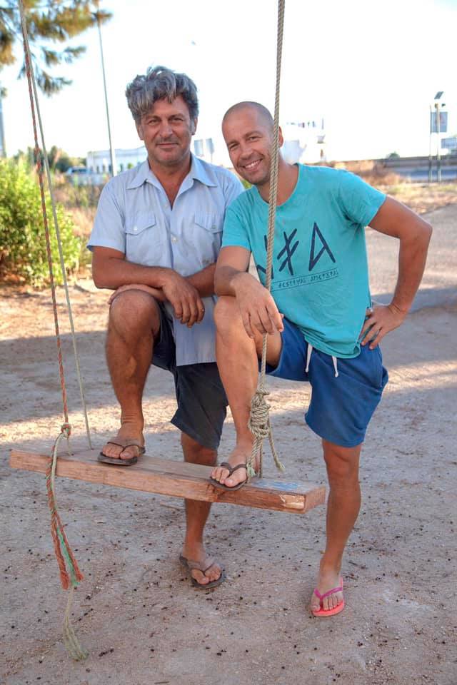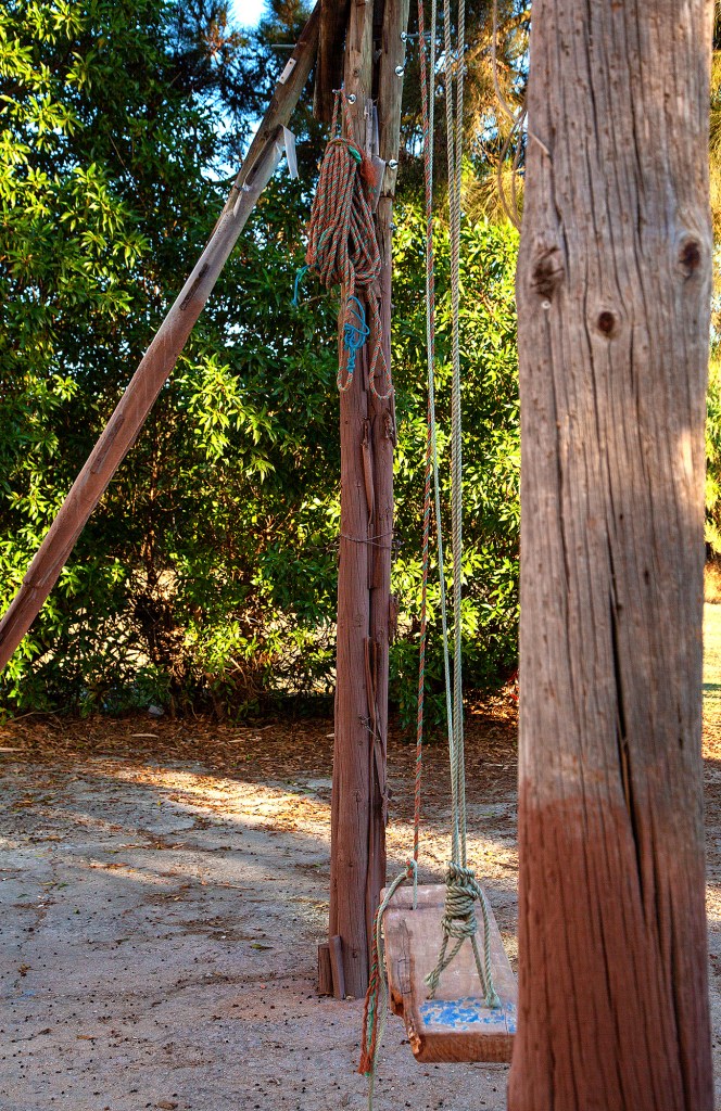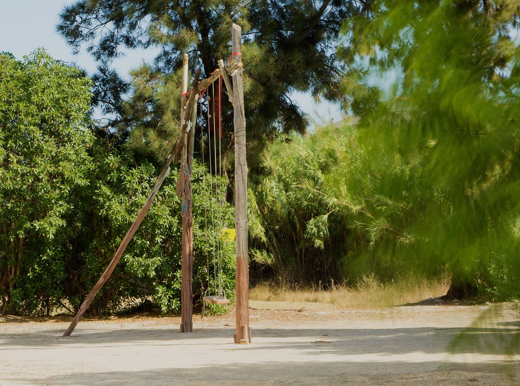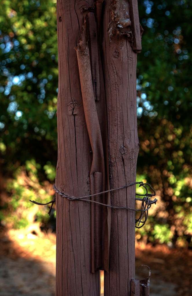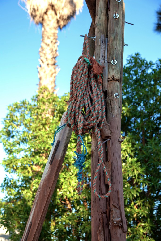 varas de madeira recuperadas de estufas, pintadas com farinha de alfarroba, cordas, correias e varão roscado